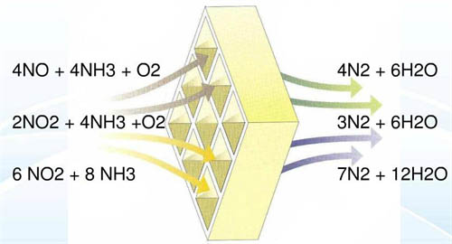 SCR脫硝技術的工藝原理是煙氣和還原劑(如NH3、液氨、尿素)與空氣的混合物在經過SCR反應器的蜂窩式或板式催化層時,煙氣中的NOx(主要是NO以及少量的NO2)和加入SCR反應器中的還原劑、空氣中的O2發生選擇性催化還原反應,生成無污染的N2和H2O。