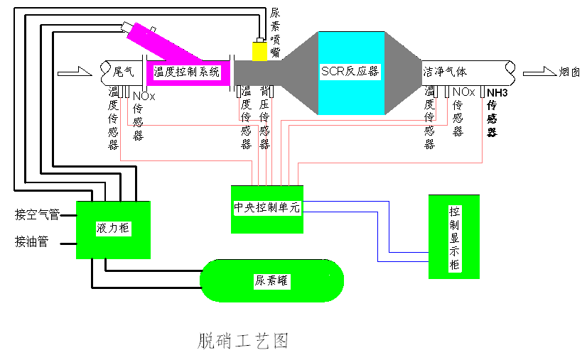 SCR脫硝設備主要由反應器、尿素存儲罐、尿素噴射箱、噴射柜、噴嘴、SCR控制、SCR反應室等部分組成。當煙氣經過SCR反應器的催化層時,發生選擇性催化還原反應。